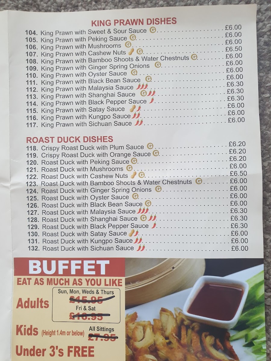 Peking Spare Ribs, Crispy Chicken Spring Rolls, Crispy Roast Duck with Plum Sauce, Chicken with Lemon Sauce, King Prawns with Satay Sauce, Beef with Ginger Spring Onions, 2x Large Young Chow Fried Rice
