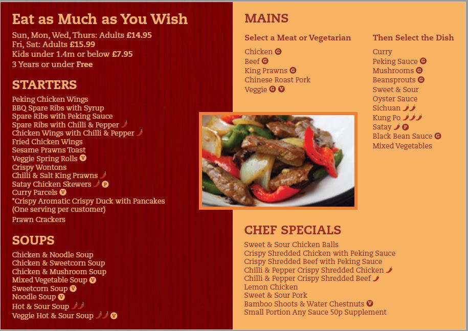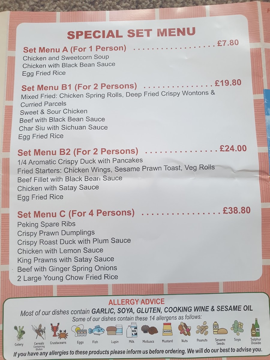 Mixed Fried (Chicken Spring Rolls, Deep Fried Wanton, Curried Parcels), Sweet & Sour Chicken, Beef with Black Bean Sauce, Char Siu with Sichuan Sauce, Egg Fried Rice
